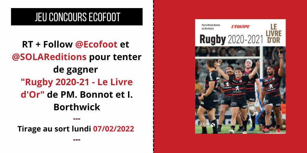 🎁 JEU CONCOURS 🚨 👉 On vous fait gagner un exemplaire de "Rugby 2020-21 - Le Livre d'Or" de PM. Bonnot et I. Borthwick Pour y participer : 1⃣ RT le tweet 2⃣ Follow @Ecofoot & @SOLAReditions 👉 Le gagnant sera désigné le 07.02.2022 Bonne chance à tous ! 🍀