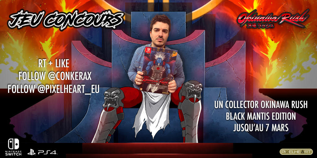 🎁 #Concours pour la magnifique édition collector Black Mantis d'Okinawa Rush qu'on vous fait gagner sur la plateforme de votre choix ! (PS4 ou Switch) Pour participer : - RT - Follow @conkerax - Follow @PixelHeart_eu - Mettre un ❤️ ☄️TAS : 07/03 😉 Bonne chance à tous ! 🙌