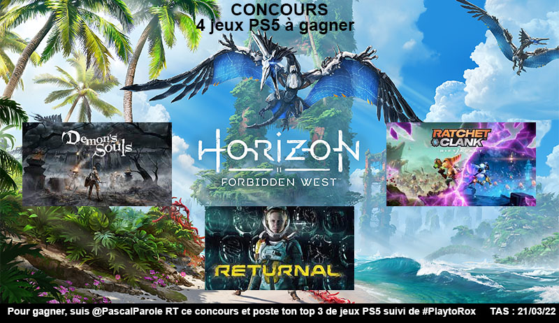 #CONCOURS 4 jeux PS5 à gagner 🕹 Horizon Forbidden West en boite, Returnal, Ratchet & Clank, Demon’s Soul en demat 1️⃣FOLLOW @pascalparole 2️⃣RT ce tweet 3️⃣Dis en commentaire ton top 3 de jeux PS5 suivi de #PlayToRox Joue aussi ici 👉 https://t.co/qdVmVLMOAs