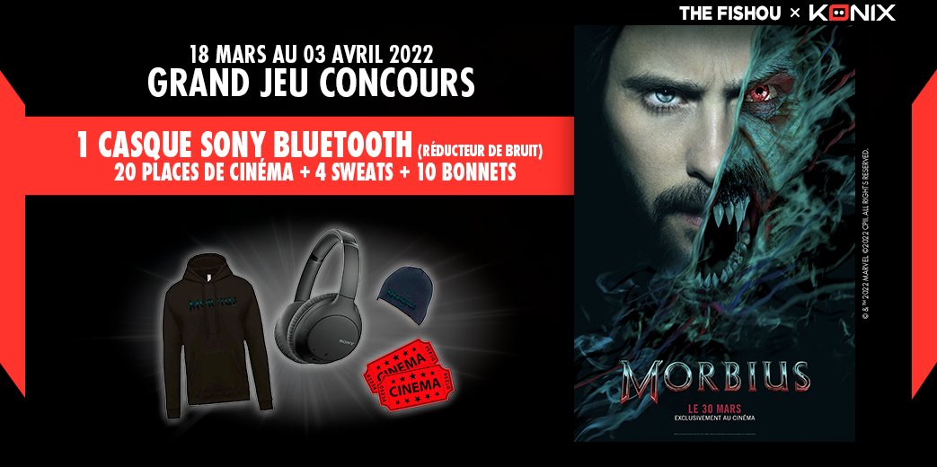 Jeu TheFishou n°345891 pour gagner 1 casque audio à réduction de bruit Sony , 4 sweat du film Morbius , 20 places de cinéma pour le film Morbius , 10 bonnets