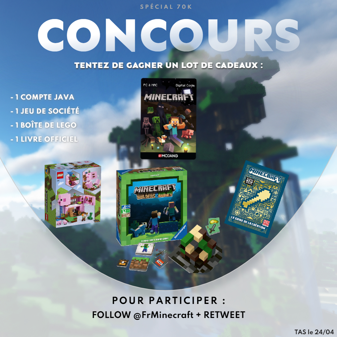 🎁 CONCOURS 🎁 🎊 Vous êtes 70K à nous suivre sur Twitter, et pour vous remercier, voici un concours ! Tentez de gagner un lot de cadeaux d'une valeur de 100€ : Pour participer : RT + FOLLOW @FrMinecraft TAS le 24/04 - 4 gagnants