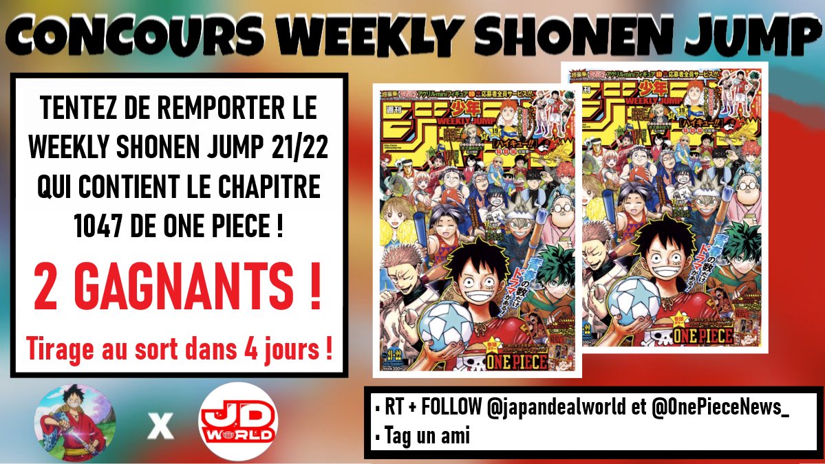CONCOURS pour tenter de remporter 2 exemplaires du WSJ 21/22 qui contient le chapitre 1047 de One Piece ! #ONEPIECE1047 • Follow @japandealworld et @0nePieceNews_ • RT ce tweet • Tag un ami 2 GAGNANTS ! Tirage au sort dans 4 jours !