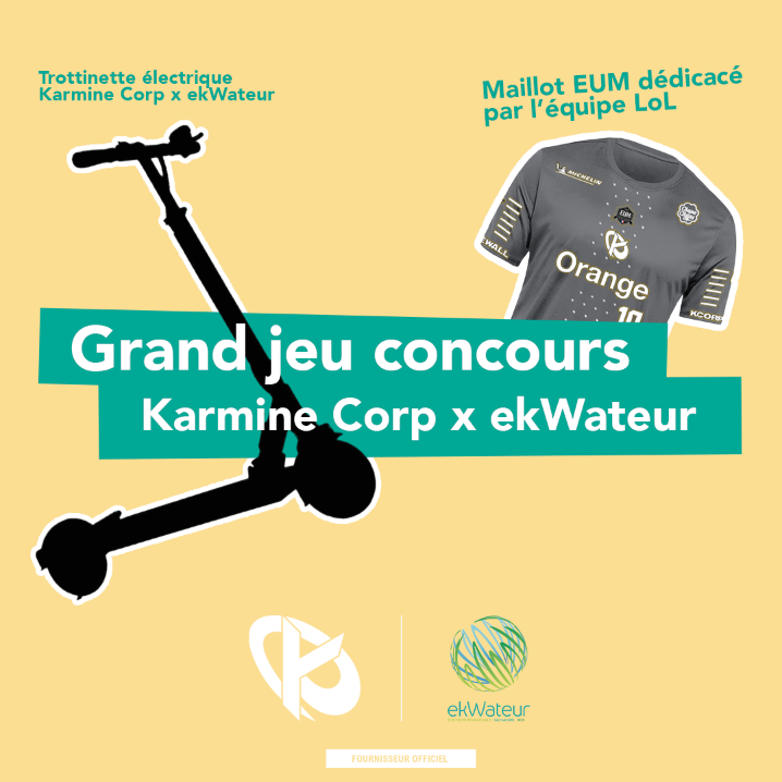 Et pour l'occasion, on organise un jeu concours pour gagner un maillot EUM dédicacé par toute l’équipe de LoL, ainsi qu’une trottinette électrique KCORP x ekWateur 🛴 Pour gagner : follow @ekWateur et @KarmineCorp + RT ce post avec #KCORP😁 Tirage au sort le vendredi 6 mai !