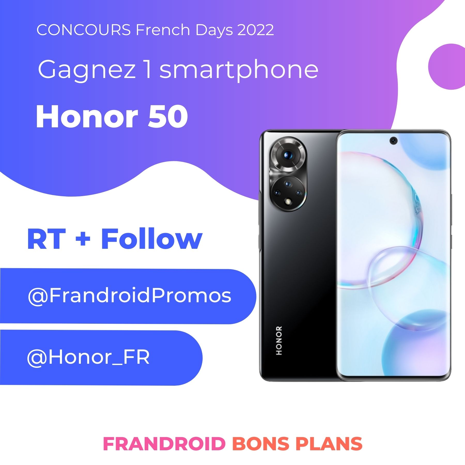 #CONCOURS #FrenchDays2022 On vous fait gagner un smartphone Honor 50 👉 https://t.co/E752wwihrA Pour participer : ➡️ RT ce tweet ➡️ Follow les comptes @FrandroidPromos et @Honor_FR TAS le 09/05/2022 à 17h ! Bonne chance à toutes et à tous 🍀