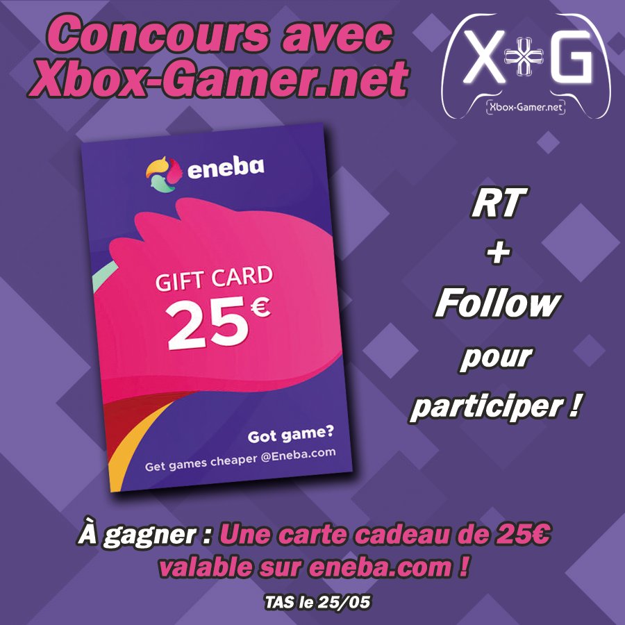 Pour célébrer notre récent partenariat avec @EnebaFr, nous lançons un concours pour vous faire gagner une carte cadeau de 25€ pour le lot de votre choix (carte cadeau, jeu, abonnement XGP) 🟢Pour participer : - RT+Follow @XboxGamerNet et @EnebaFr TAS le 25 mai à 23H59