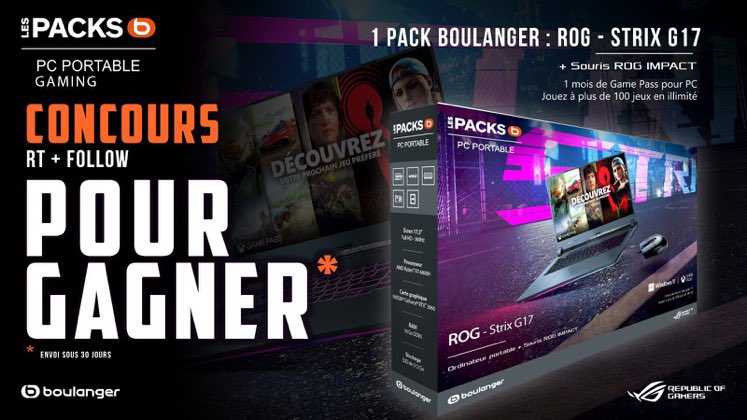 🔴 CONCOURS 02 🔴 Concours pour gagner un pack composé : D’un ordinateur ROG Strix G17 (valeur 1500e) avec une souris ROG IMPACT Pour participer : - RT le tweet 🔁 - Follow @PatrickAdemo @ASUS_ROG_FR @boulanger - Réponds à ce tweet avec le #ROGxBOUL TAS le 22/08/22
