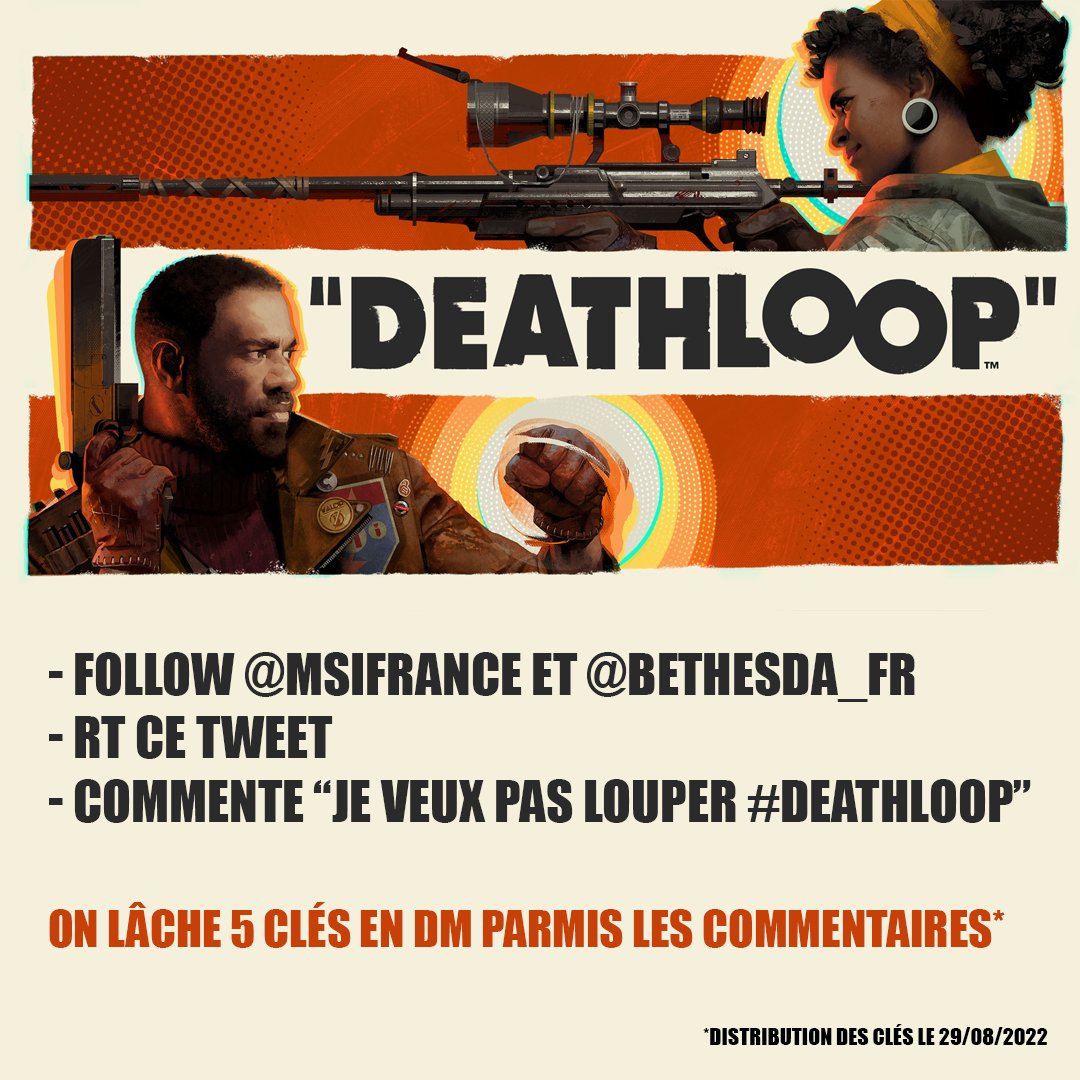 Allez on vous fait gagner 5 clés DEATHLOOP ! -Follow @msifrance + @Bethesda_fr -RT - Commente "Je veux pas louper #Deathloop " Fin du game le 29/08/22 🏆 #Concours #QuakeCon 🏆