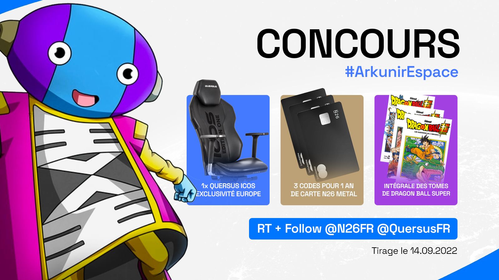 Les reufs pour finir l'arc dans l'espace petit concours pour vous faire gagner 5 lots : Un siège Quersus Icos (big exclu européenne), 3 codes N26 et l'intégrale des tomes de Dragon Ball Super 😄 Pour participer : 1. Suivre @N26FR + @QuersusFR 2. RT le tweet ⏳TAS le 14/09🍀
