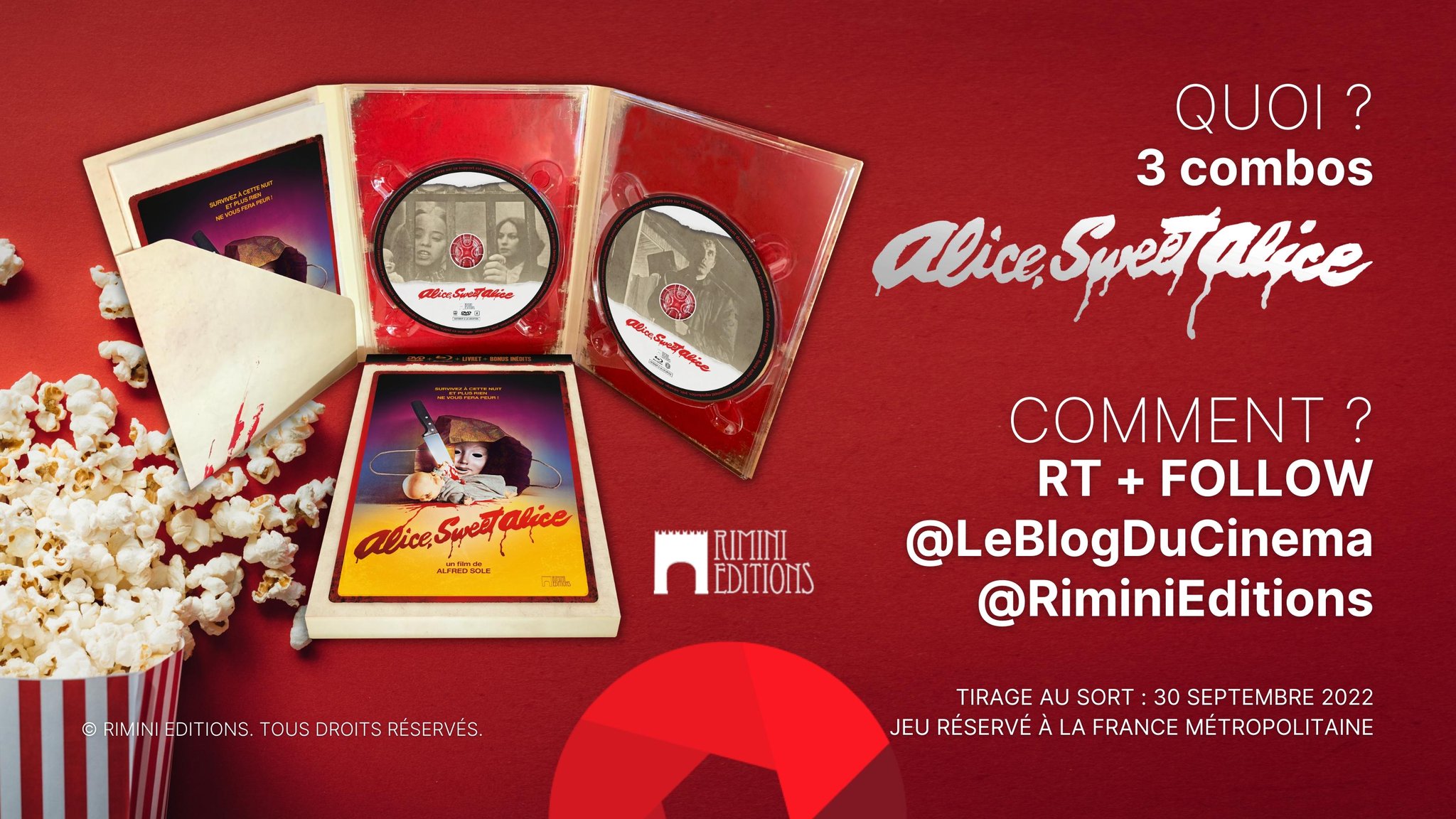 Concours ALICE SWEET ALICE 🎁 À gagner : 3 combos du thriller horrifique malsain, dérangeant et diabolique ! 1️⃣ Suivre @LeBlogDuCinema et @RiminiEditions 2️⃣ RT ce Tweet ⌛ Tirage au sort : 30 septembre 2022