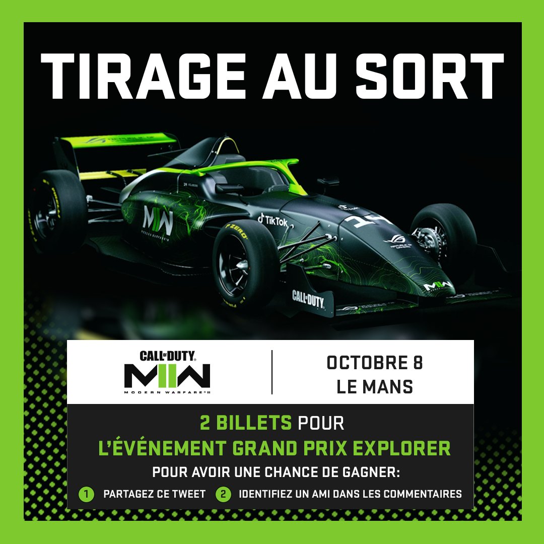 Pour célébrer notre partenariat #MWII avec @xsqueezie et @gotaga, nous offrons 2 billets pour l'événement GP Explorer au Mans, qui se déroulera à guichet fermé le 8 octobre. 🏎️ Pour avoir une chance de gagner : 1️⃣ Partagez ce tweet 2️⃣ Identifiez un ami dans les commentaires