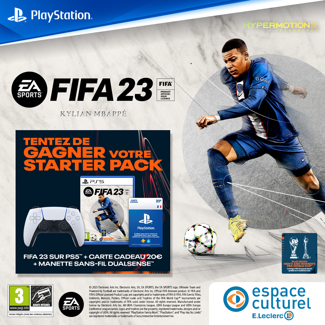 • 2 lots composés de 1 jeu vidéo PS5 "FIFA 23" + 1 manette sans-fil PS5 + 1 carte cadeau Espace Culturel Leclerc de 20 euros valeur 146 €