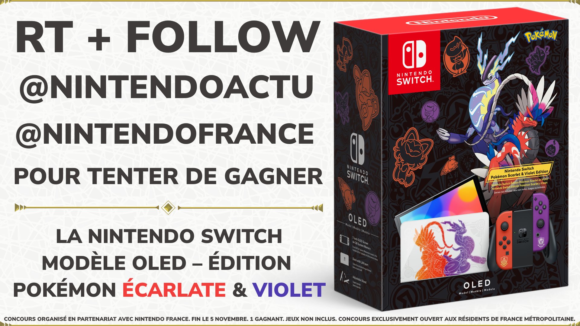 [CONCOURS] Follow @NintendoActu + @NintendoFrance + RT + tag un(e) ami(e) pour tenter de gagner la console Nintendo Switch – Modèle OLED Édition Pokémon Écarlate & Violet ! #PokemonEcarlateViolet 🎁 1 gagnant ! Fin le 05/11.
