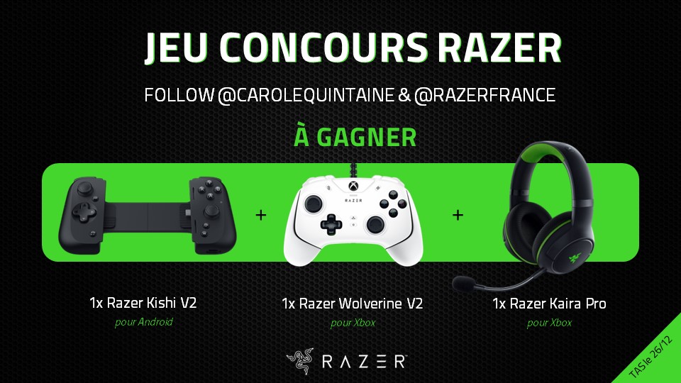 #CONCOURS 🎄 Avec @RazerFrance nous vous proposons de gagner un superbe pack : -Une Manette Wolverine V2 pour Xbox, -Un Casque Kaira Pro pour Xbox, -Un Manette Kishi V2 pour Android Pour participer : -RT + follow @RazerFrance & @CaroleQuintaine TAS : 26 décembre Good luck✨