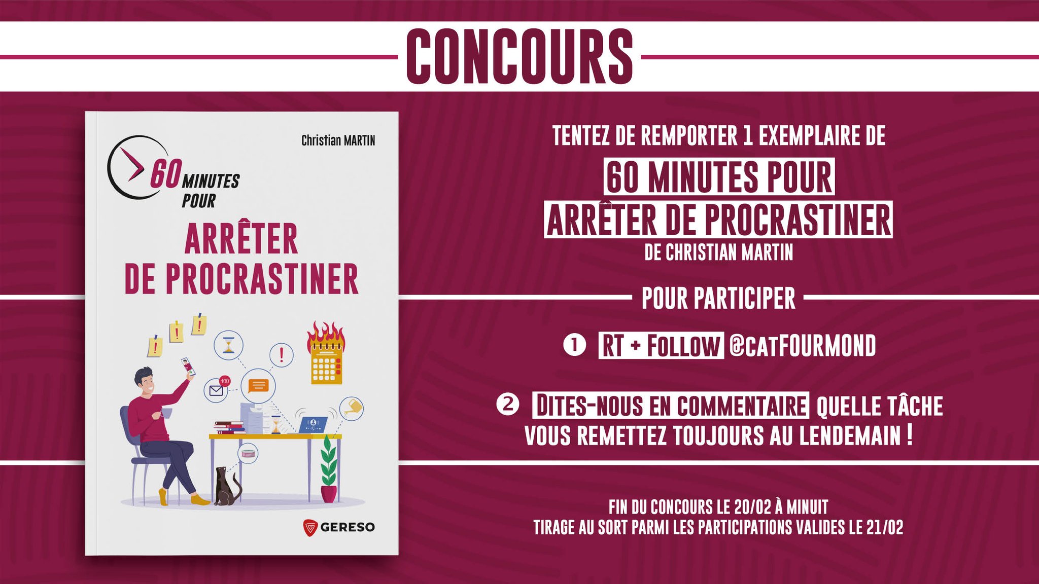 #Concours Tentez de remporter un exemplaire du #livre "60 minutes pour arrêter de #procrastiner" de Christian Martin !😊 1️⃣ RT + Follow @CatFOURMOND 2️⃣ Dites-nous en commentaire quelle tâche vous remettez toujours au lendemain ! Fin du concours le 20/02 à minuit - TAS le 21/02