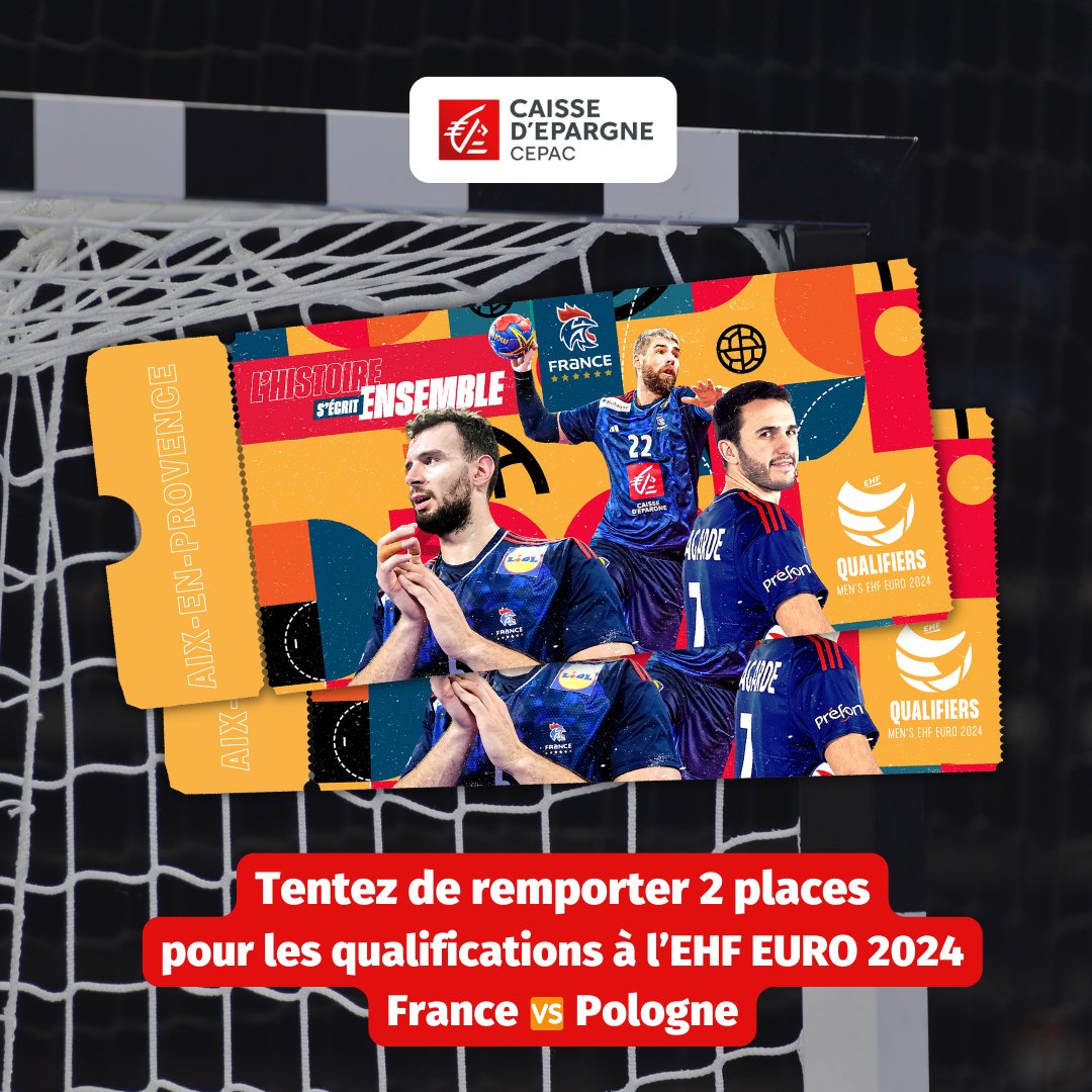 #EHFEURO2024 🤾 | Partenaire de la @ffhandball, @CE_CEPAC vous offre l'opportunité de gagner 2 places pour le match 🇫🇷 🆚 🇵🇱 à l'@ArenaAix pour les qualifications à l’@ehfeuro 2024 ✨ Pour jouer, il suffit de 👇 🔁 RT ce post ✅ Suivre la @CE_CEPAC ⚠ Être disponible le 11/03