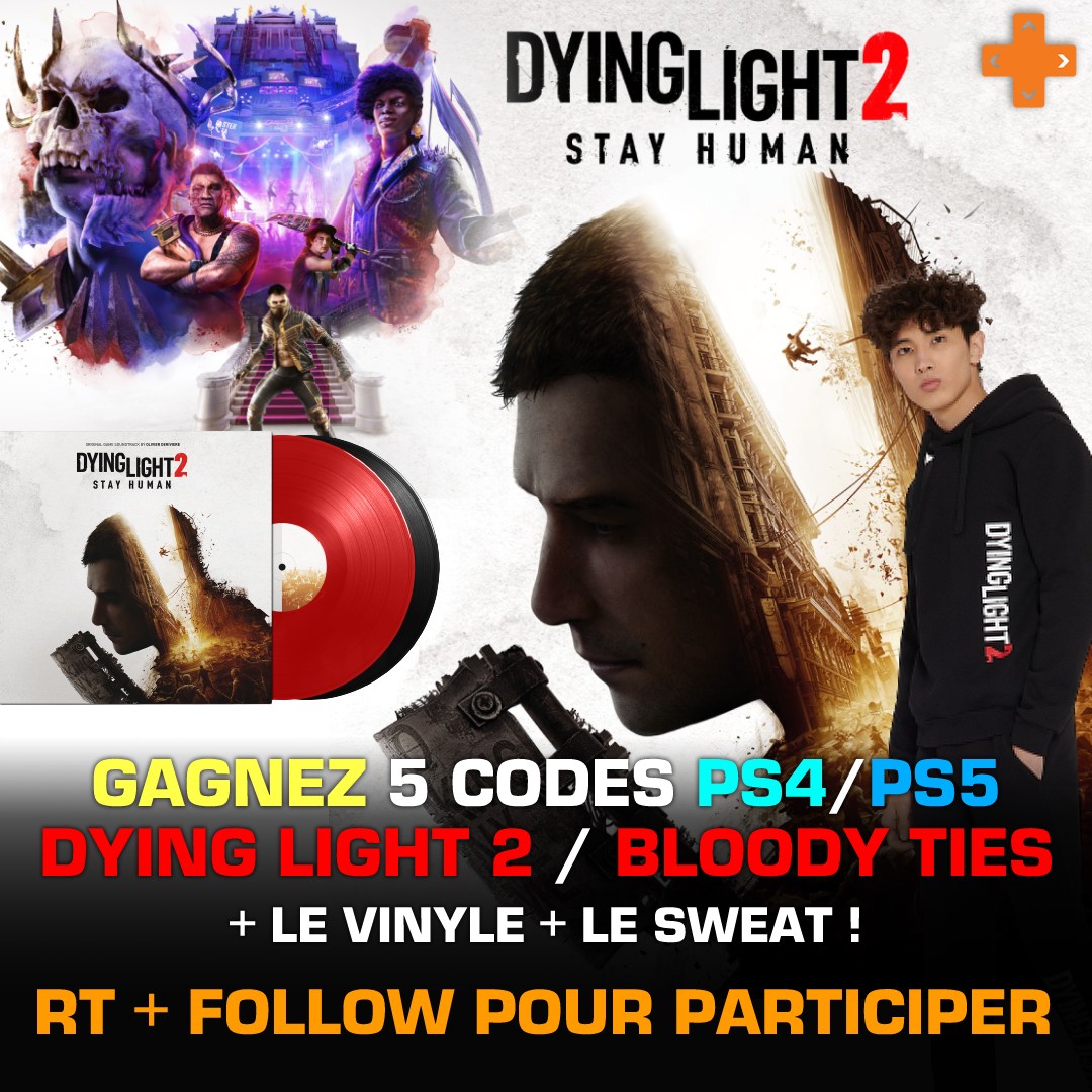 • 4 codes de téléchargement pour le jeu "Dying Light 2 - Stay Human" sur PS4 / PS5 + 1 extension + 1 sweat-shirt + 1 vinyle de la BO