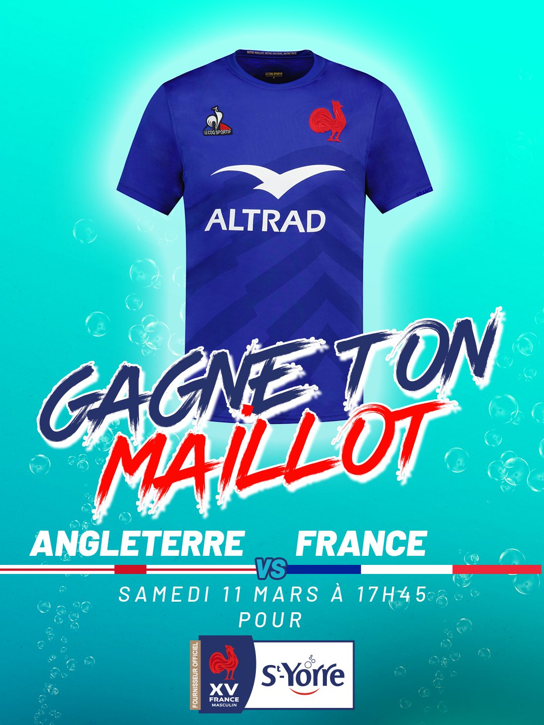 💥Gagne le maillot du #XVdeFrance ! St-Yorre, Partenaire des Bleus depuis 25 ans, vous offre un maillot des Bleus à l'occasion du 𝐂𝐑𝐔𝐍𝐂𝐇🤩 Pour jouer👉Follow @styorreFR + RT #SoifdeVictoire #ANGFRA #concours