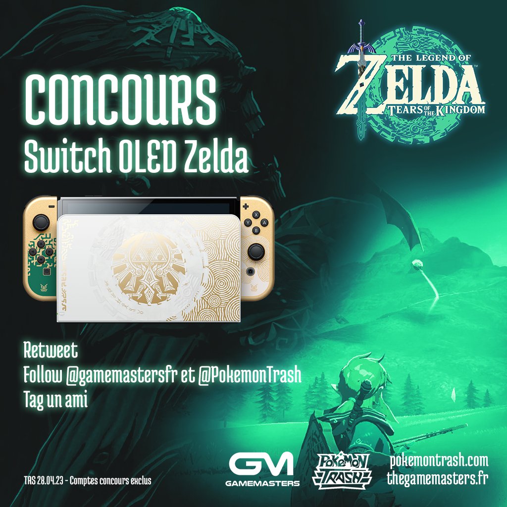 🎉Concours ! 🎉 Avec @GamemastersFr on vous fait gagner une Switch OLED Zelda pour pouvoir jouer à ... Pokémon ?! Soit. Pour participer : > RT le tweet > Follow @PokemonTrash et @GamemastersFr > Tag un.e ami.e TAS le 28/04. 1 gagnant.e. (France Métropolitaine ou Belgique)