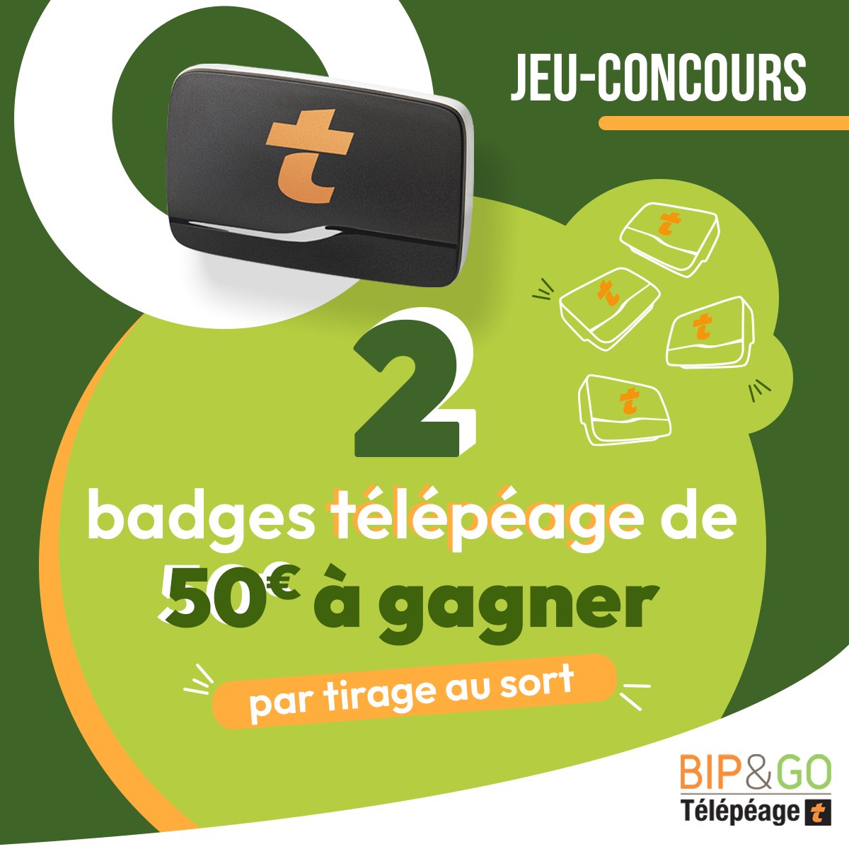 • 2 badges de télépéage Bip&Go crédités de 50 euros