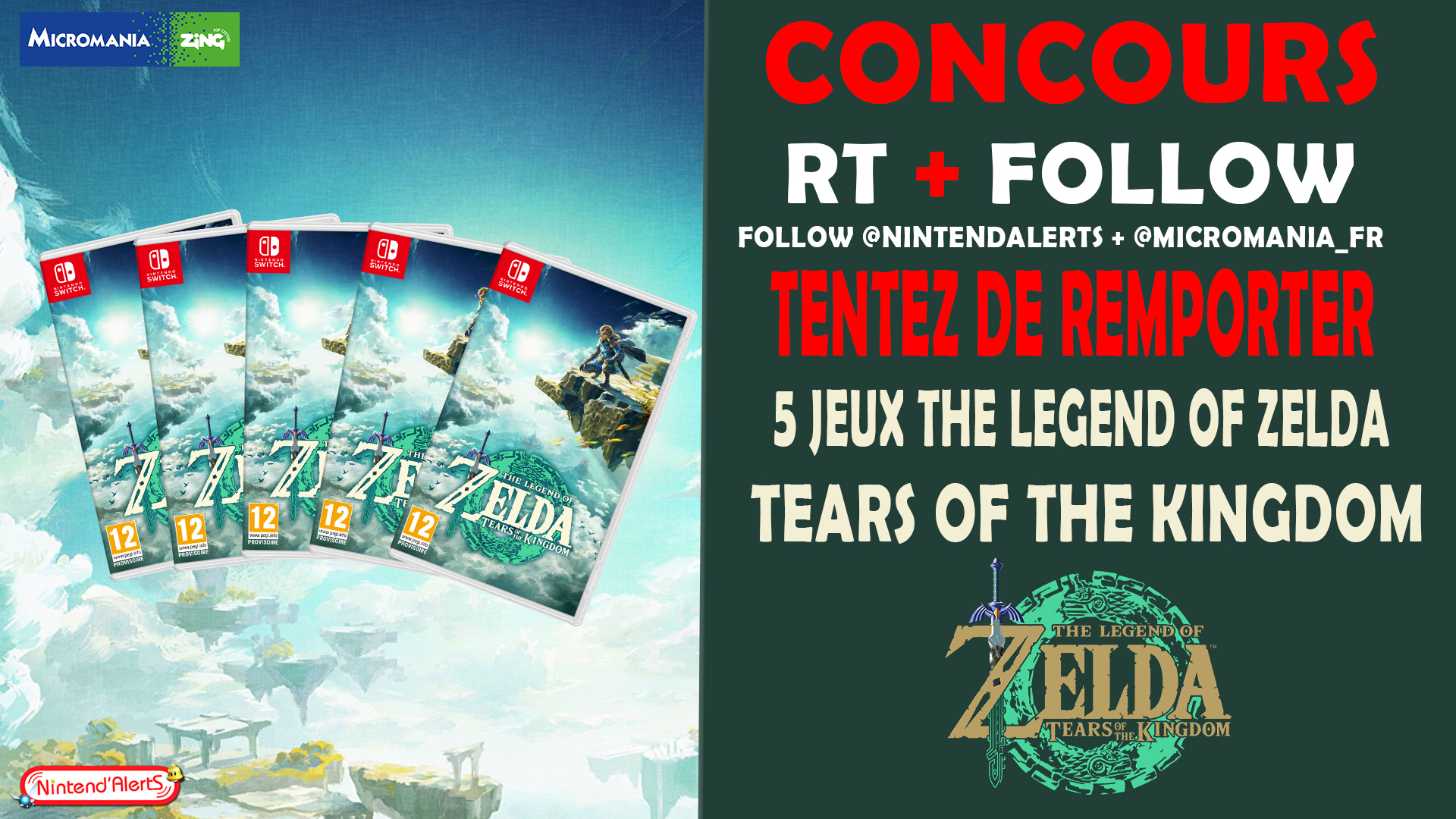 #Concours 🎁 ! 5 Jeux #ZeldaTearsOfTheKingdom sur #NintendoSwitch à gagner ! Pour participer : RT ce tweet + Follow @nintendalerts et @Micromania_Fr ! Retrouvez les produits Zelda chez Micromania ici ➡️ https://t.co/Xx5f2XvqUb Fin le 01 juillet !