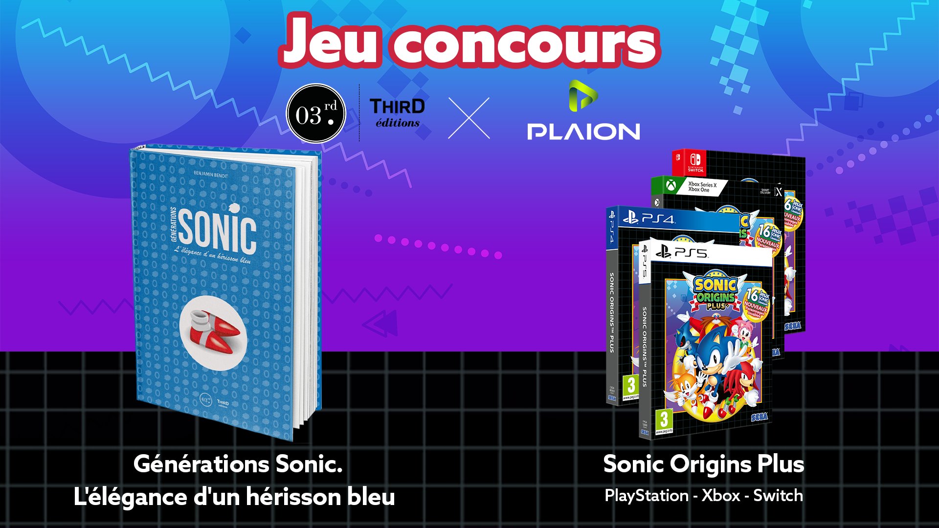 En partenariat avec @PLAION_FR nous vous proposons un concours Sonic ! Suivez @ThirdEditions et @PLAION_FR et RT ce post pour avoir une chance de gagner : - Sonic Origins Plus (sur la plateforme de votre choix) - Générations Sonic Bonne chance ! TAS : 27 juillet 1 gagnant