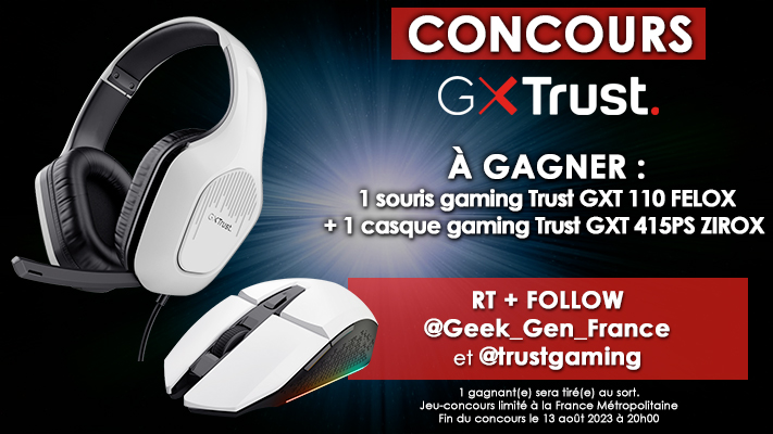 #CONCOURS 🎁 ! C'est les vacances ! A cette occasion, GeekGen et Trust Gaming vous offrent un casque gaming GTX 110 FELOX et une souris gaming GTX 415PS ZIROX. Pour participer, FOLLOW + RT : @Geek_Gen_France et @TrustGaming Bonne chance à tous 🍀