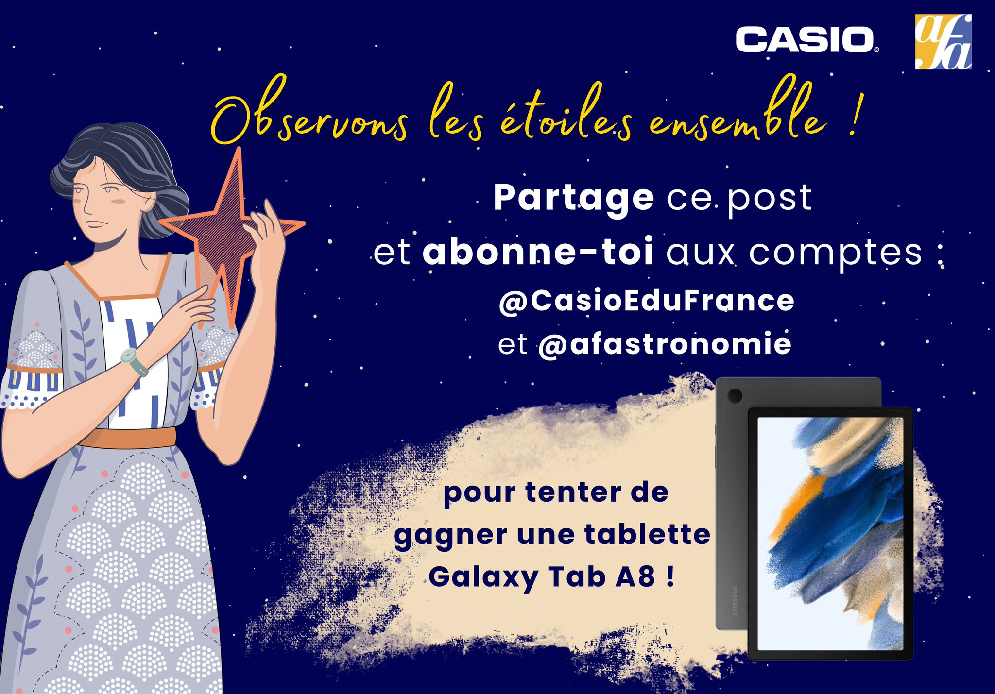 🎁 Jeu concours Nuit des Etoiles du 11 au 31 août 🎁 Observons les étoiles ensemble ! ✨ A partir du 11 août partage ce post et abonne-toi aux comptes : @CasioEduFrance et @afastronomie pour tenter de gagner une tablette Galaxy Tab 8 et une housse Cecilia Payne Gaposchkin. 🎉
