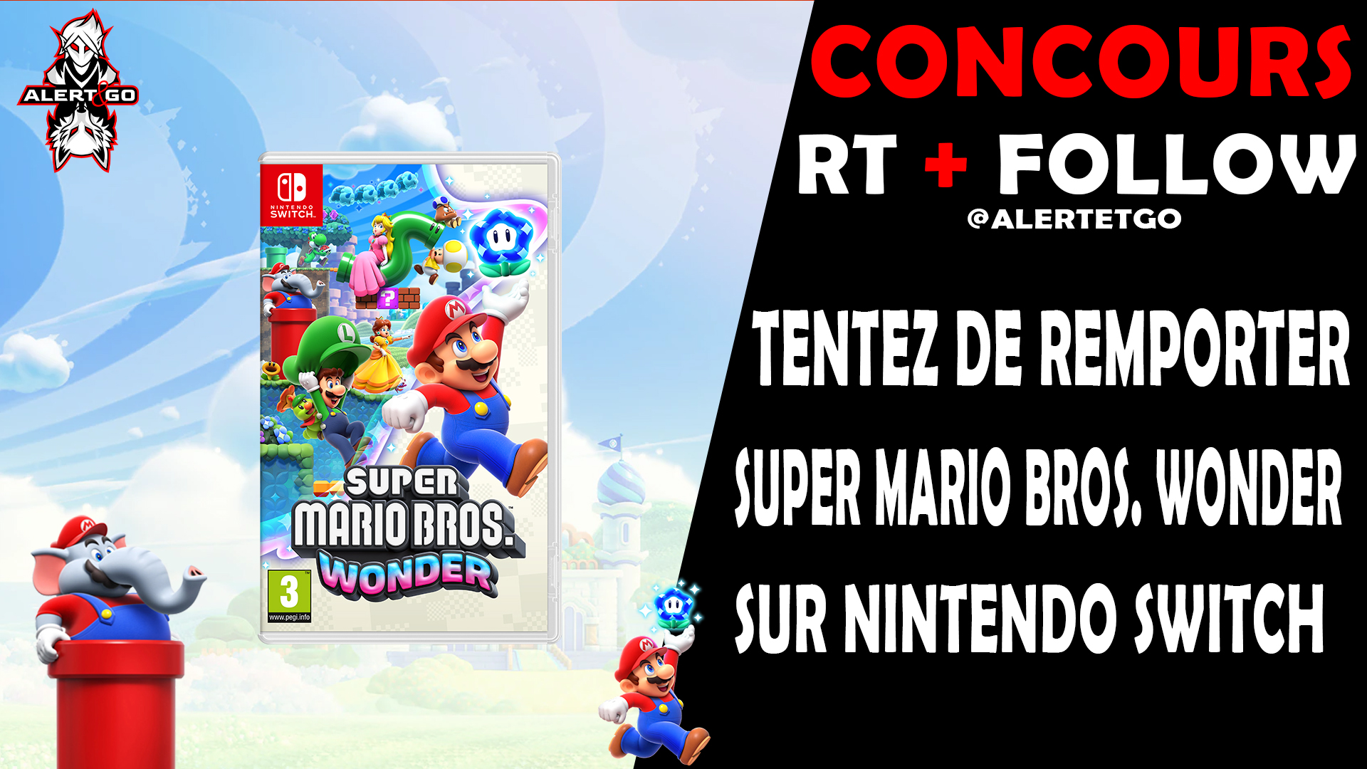 #Concours 🎁 ! Un jeu Super Mario Bros. Wonder Nintendo Switch à gagner ! Pour participer : follow @AlertEtGo + RT ce tweet ! Retrouvez les meilleurs prix pour le jeu ici ► https://t.co/bVwJsnwufQ Fin le 17 octobre !