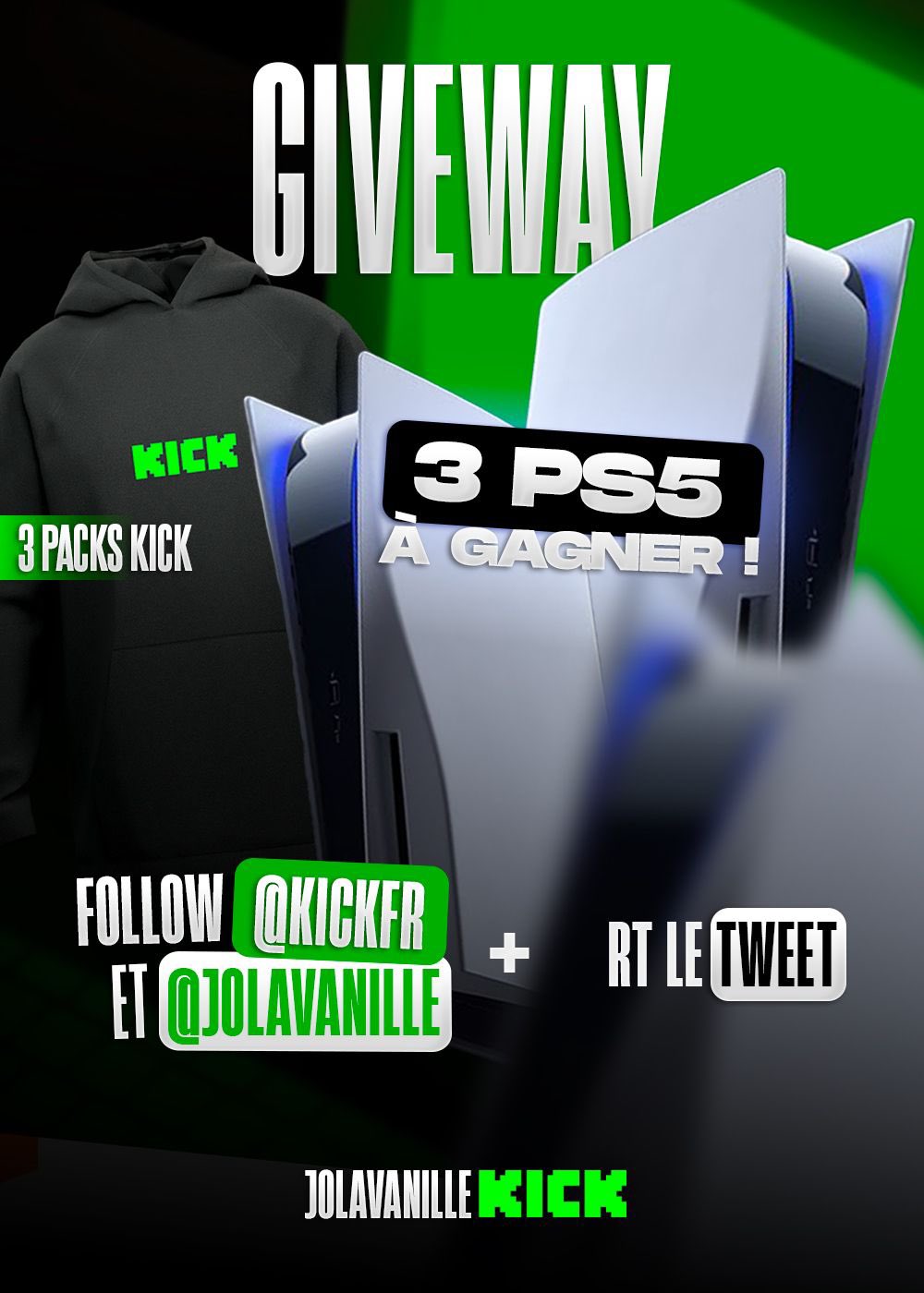 BIG CONCOURS AVEC KICK POUR MON ANNIV 💚🎉 Avec la miff de chez kick on vous régale avec 3 pack PS5 : - 3 PS5 - 3 hoodie kick Pour participer il vous suffit de #RT + #FOLLOW @JoLaVanille et @kickfrancais Bonne chance la miff 💚 TAS 25/11