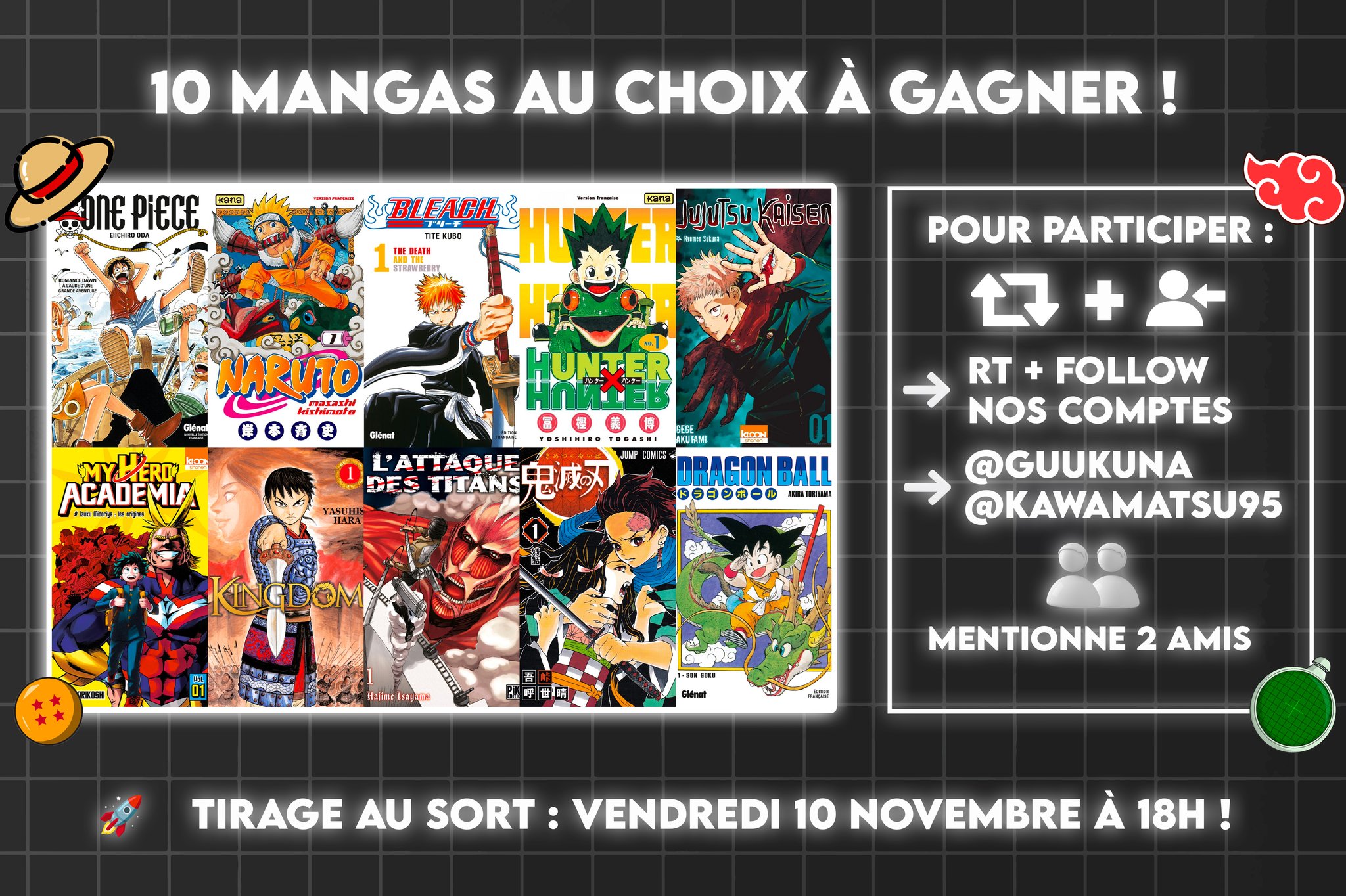🚨 10 MANGAS AU CHOIX À GAGNER ! Afin de vous faire plaisir, moi et @guukuna on vous fait gagner 10 mangas au choix ! Pour participer : 🔁 RT le tweet + Follow @guukuna @Kawamatsu95 👥 Mentionne 2 amis 🎁 Tirage au sort : Vendredi 10 Novembre à 18h !