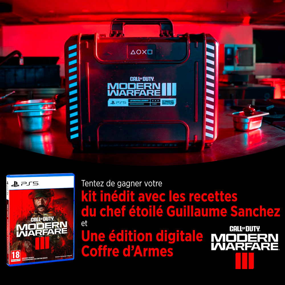 • 1 kit "Call of Duty : Modern Warfare III" composé de 1 jeu vidéo PS5 + 1 manette + 1 livret de recettes du chef étoilé Guillaume Sanchez