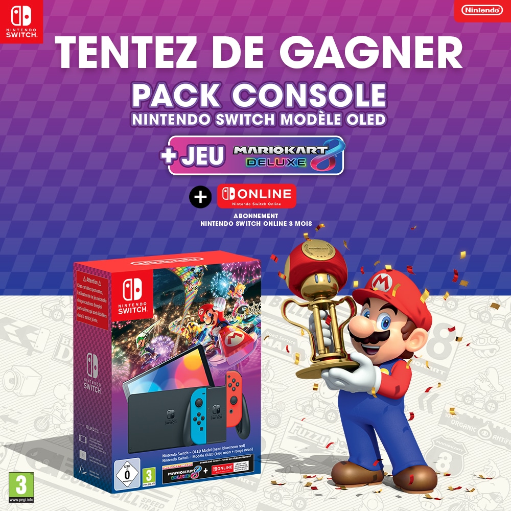 • 1 console de jeux Nintendo Switch OLED avec le jeu "Mario Kart" et 3 mois d'abonnement au Nintendo Switch Online