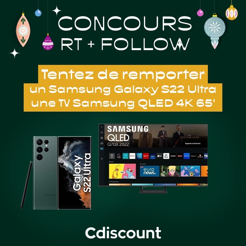 🤶 #Concours ⚫ C'est déjà Noël sur Cdiscount 👉 https://t.co/lRxBthjDYY 🔶 RT + FOLLOW @Cdiscount 🎁 Pour tenter de remporter un Samsung Galaxy S22 Ultra et une TV Samsung QLED 4K UHD 65” 🍀 TAS le 08/12