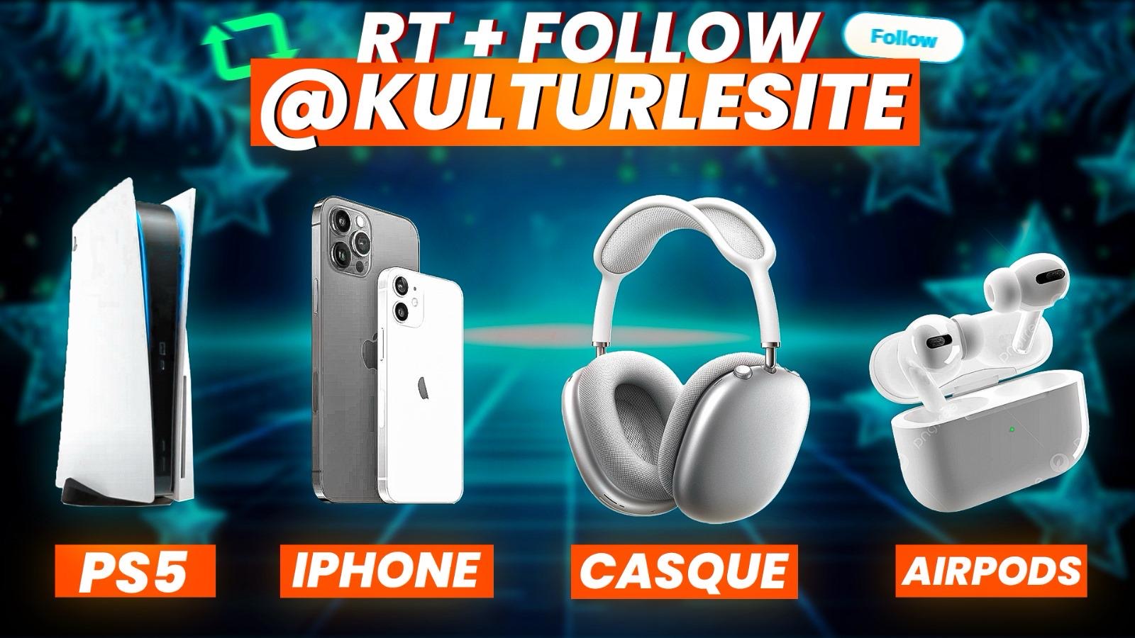 🚨 CONCOURS DE NOËL 🎅🏼 ! On vous fait gagner ces 4 LOTS : 🎁 LOT 1 : UNE PS5 🎁 LOT 2 : UN IPHONE 15 🎁 LOT 3 : UN CASQUE 🎁 LOT 4 : AIRPODS Pour participer : RT + FOLLOW @Kulturlesite_ Mentionne un ami en commentaire.
