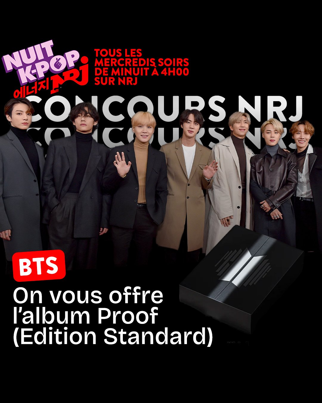 ⚪️ Concours #BTS Tous les mercredis, c'est la Nuit K-Pop sur NRJ. Cette semaine, on vous offre l'album "PROOF" des @bts_bighit 🤩 Pour participer : ➡️ Follow @nrjhitmusiconly ➡️ Citez ce tweet avec le hashtag #NUITKPOPNRJ et votre titre préféré des BTS