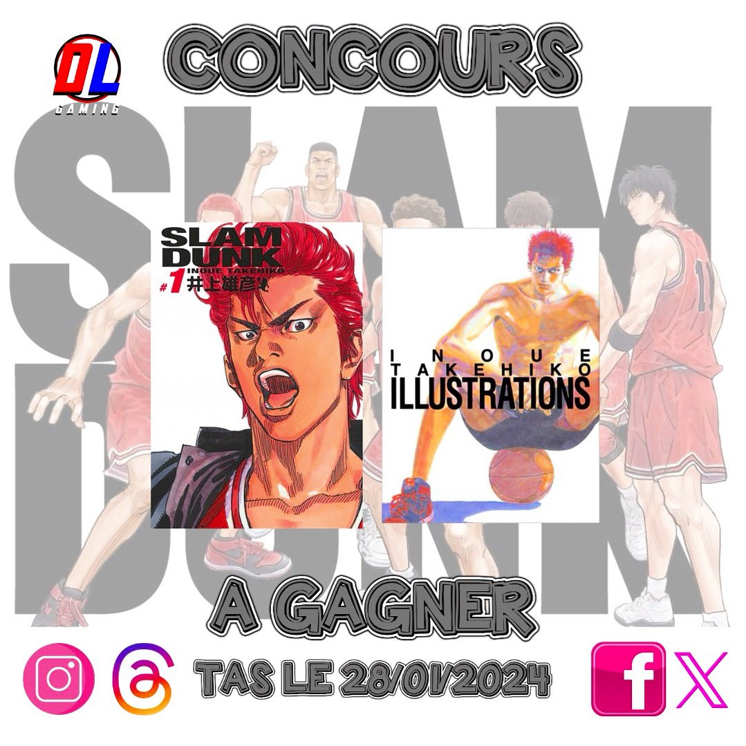 🏀 Concours Slam Dunk 🏀 À gagner le tome 1 de Slam Dunk Édition Deluxe ➕ 1 Artbook Takehiko Inoue Illustrations 𝗣𝗼𝘂𝗿 𝗽𝗮𝗿𝘁𝗶𝗰𝗶𝗽𝗲𝗿: 🏀 Follow @DLGAMING22 🏀 Liker 🧡 & RT 🏀 Invite 3 amis 🏀 TAS le 28/01/24 Bonne chance à tous 😘 #CONCOURS #SLAMDUNK #manga
