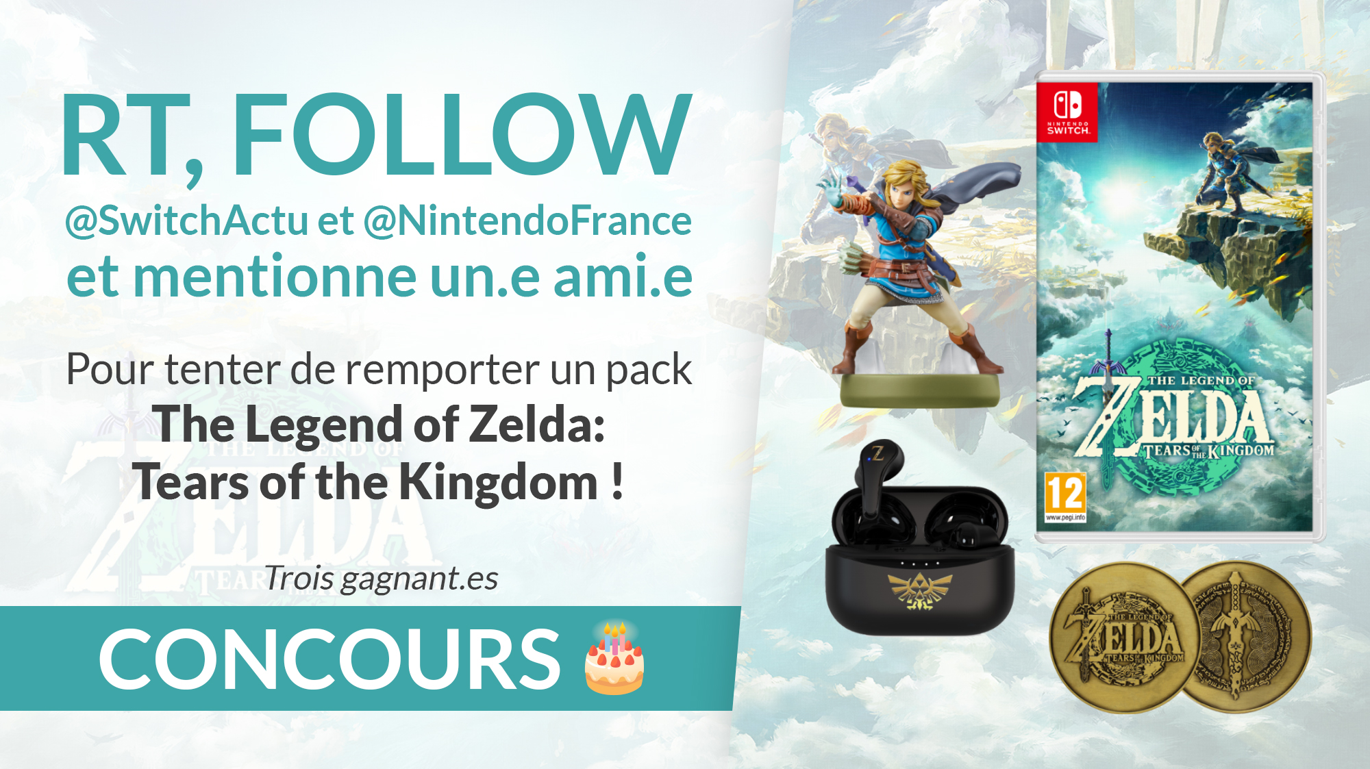 #CONCOURS 🎂 - Pour fêter notre 7e anniversaire, nous vous offrons trois packs The Legend of Zelda: #TearsOfTheKingdom ! Chaque pack est composé d'un exemplaire du JEU, d'un AMIIBO Link, d'une paire d'ECOUTEURS et d'une MEDAILLE à l'effigie du jeu ! Pour participer : 🔁 RT ce