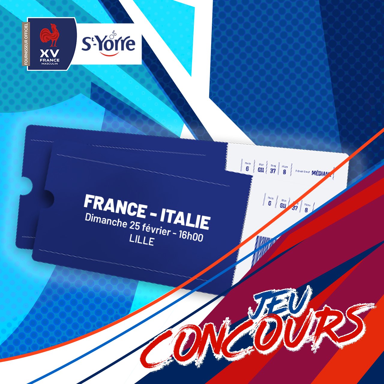 🎁 Avec St-Yorre tente de gagner 𝟐 𝐩𝐥𝐚𝐜𝐞𝐬 pour 𝐅𝐑𝐀𝐍𝐂𝐄 – 𝐈𝐓𝐀𝐋𝐈𝐄 😃 🏟️Match à 16H00 le 25 février à Lille. Pour jouer : 👉𝐅𝐨𝐥𝐥𝐨𝐰@styorreFR + 𝐑𝐓 Bonne chance 😉 #SoifdeVictoire #FRAITA #JeuConcours #SixNations