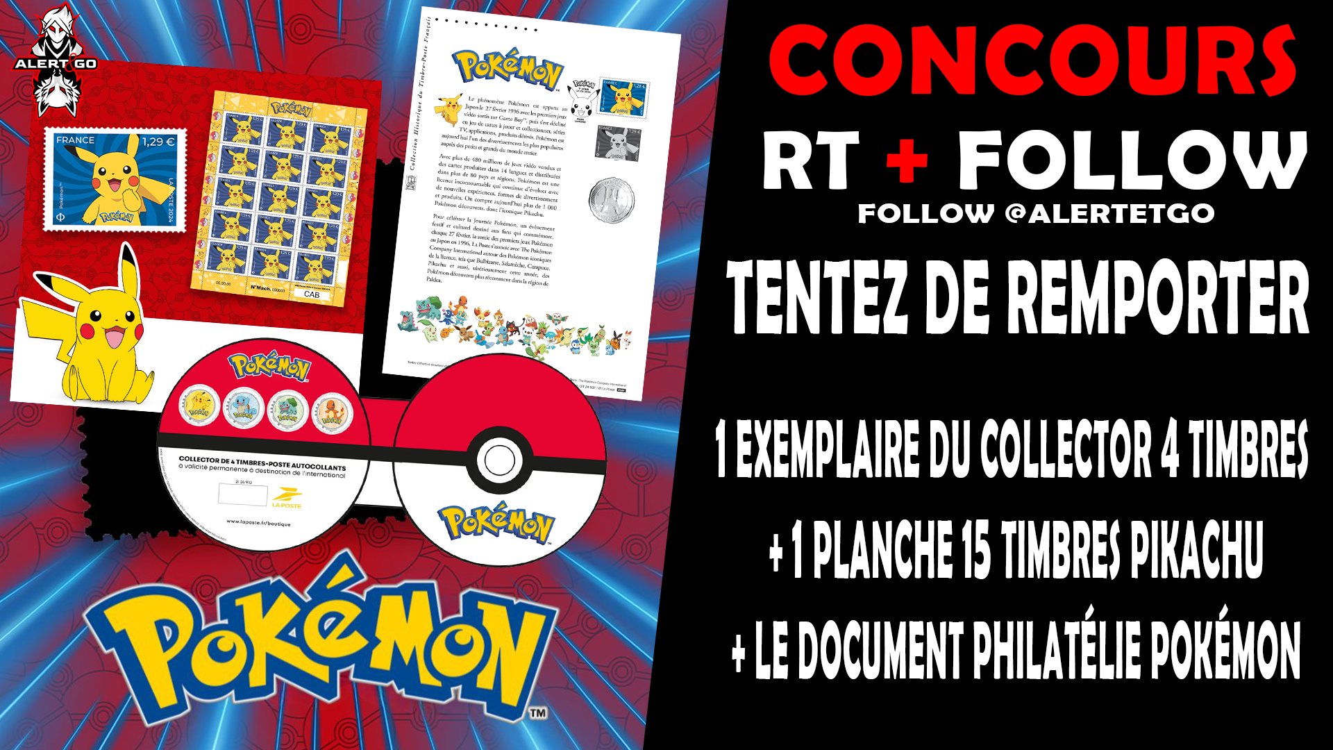 #Concours ! Un set complet Pokémon X La Poste à gagner (planche de 15 timbres , Collector de 4 timbres et document philatélie) ! Pour participer : ➡️ Follow @AlertEtGo ➡️ RT ce tweet Fin du concours le 20 mars.