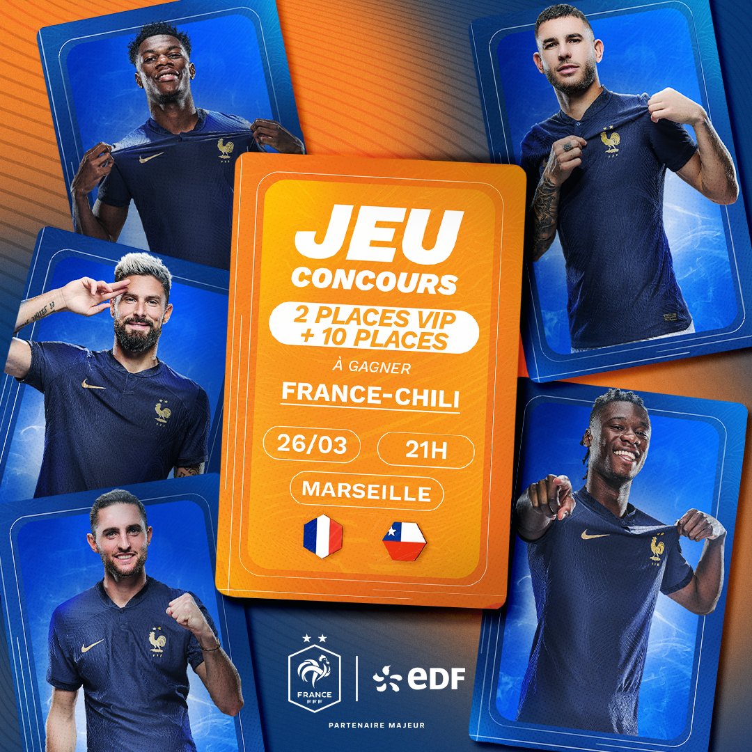 🎟 JEU CONCOURS 🎟 Après l’Allemagne, nos Bleus feront face au Chili 🔥 Une très belle affiche qui aura lieu à Marseille 🤯 Vous souhaitez assister à la rencontre ? Nous mettons en jeu 12 places dont 2 places VIP 🤩 Pour participer : 1️⃣ Follow @energiedufoot 2️⃣ RT ce tweet
