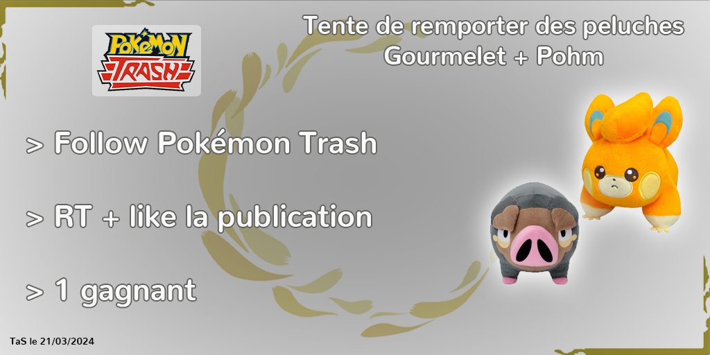 #Concours Grâce à @mecchaJP, nous vous faisons gagner ces magnifiques peluches Pohm et Gourmelet. Pour participer : Follow @PokemonTrash RT et like la publication (TaS le 21/03, 1 gagnant, France Métropolitaine uniquement)