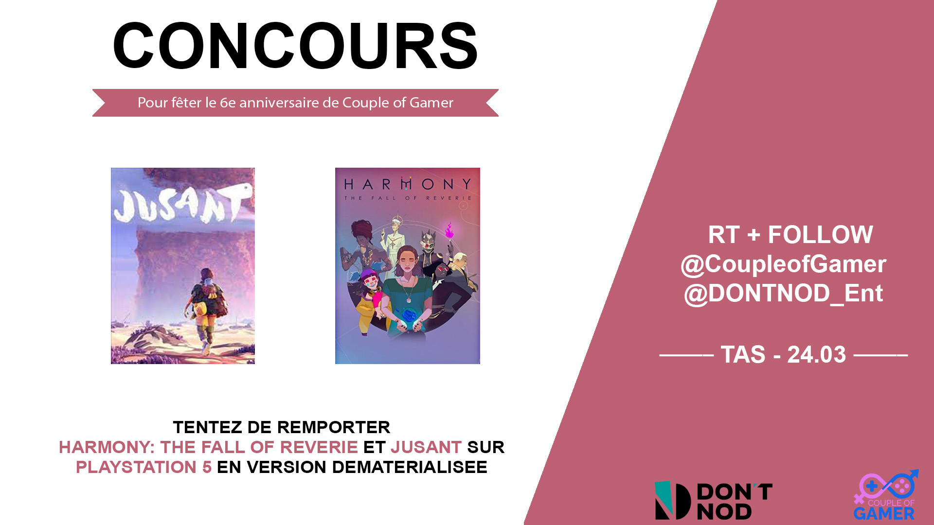 #Concours Pour fêter nos 6 ans On vous fait gagner Harmony: The Fall of Reverie et JUSANT sur #PlayStation5 en version dématérialisée Pour participer RT + Follow @CoupleOfGamer + @DONTNOD_Ent TAS le 24/03 🍀Bonne chance🍀 #CoG