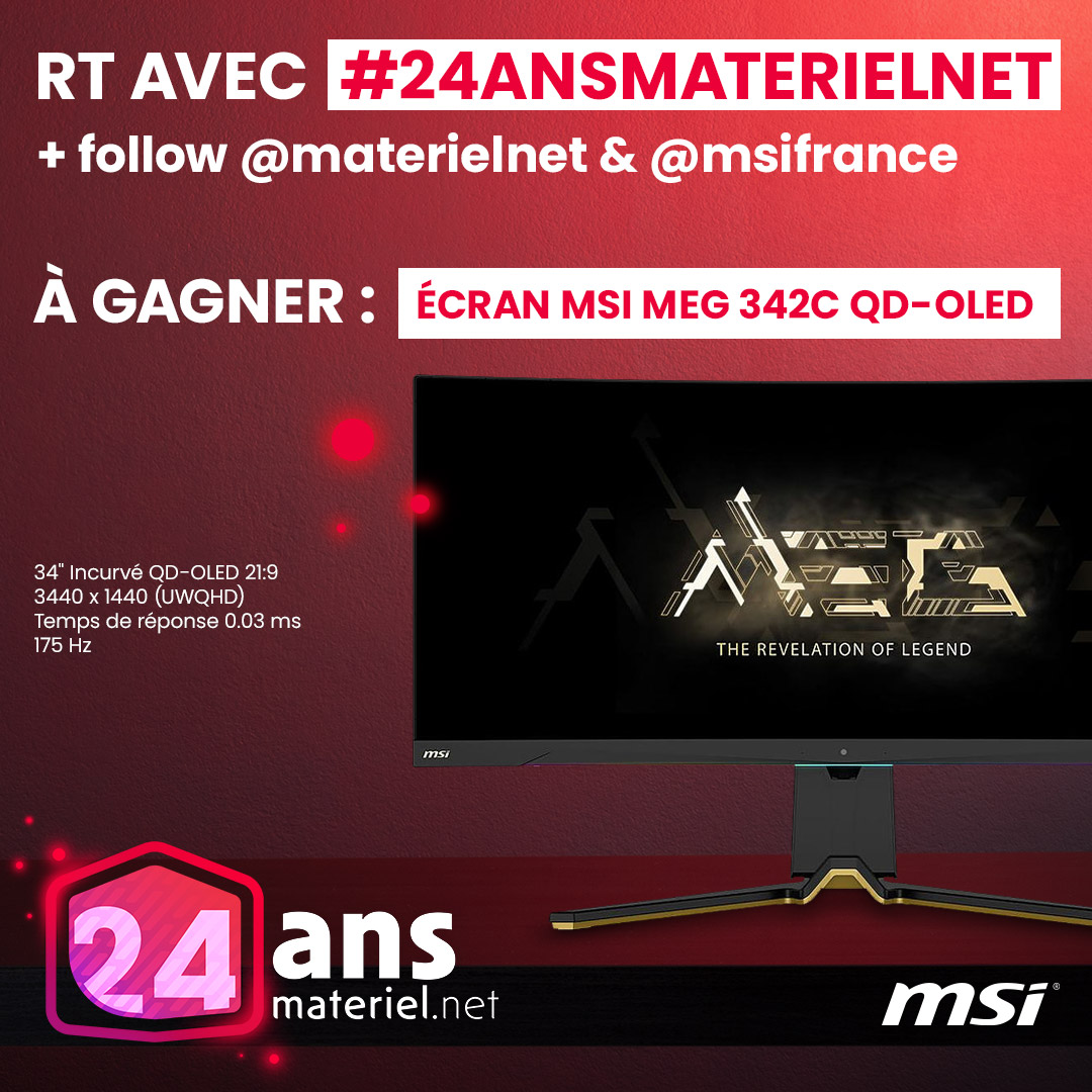 🎁 𝐂𝐎𝐍𝐂𝐎𝐔𝐑𝐒 𝐀𝐍𝐍𝐈𝐕𝐄𝐑𝐒𝐀𝐈𝐑𝐄 🎁 On vous régale avec un écran 34 pouces QD-OLED 🤩 👉 RT avec #24ansMaterielNet + Follow @materielnet & @msifrance pour tenter de le remporter ! 🔥 💰 Valeur 999€95 🎰 TAS 11/04 📋 https://t.co/UyDiDpqu0X