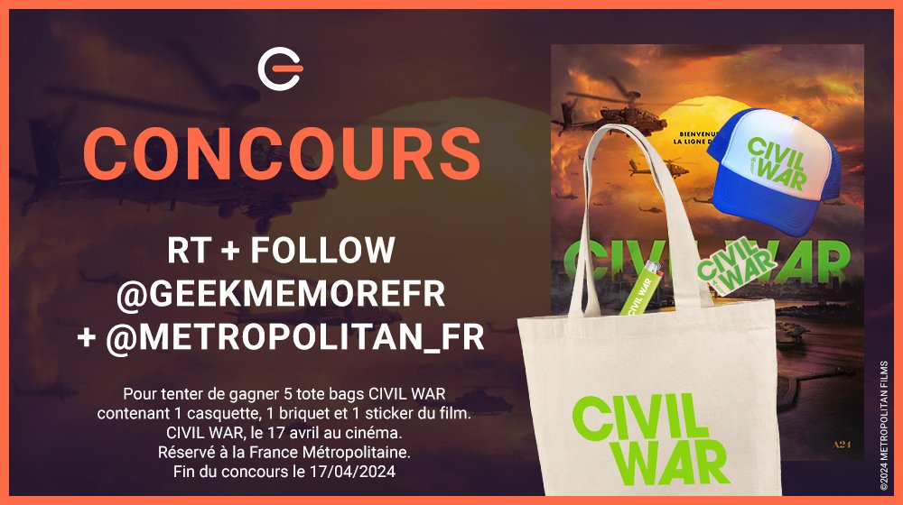 🚨 CONCOURS 🚨 Pour la sortie de Civil War, le 17 avril prochain au cinéma, Metropolitan Films vous proposent de remporter 5 tote bags comprenant 1 casquette, 1 briquet et un sticker aux couleurs du film : RT + Follow @Metropolitan_Fr et @GeekmemoreFR Commentez avec #CivilWar