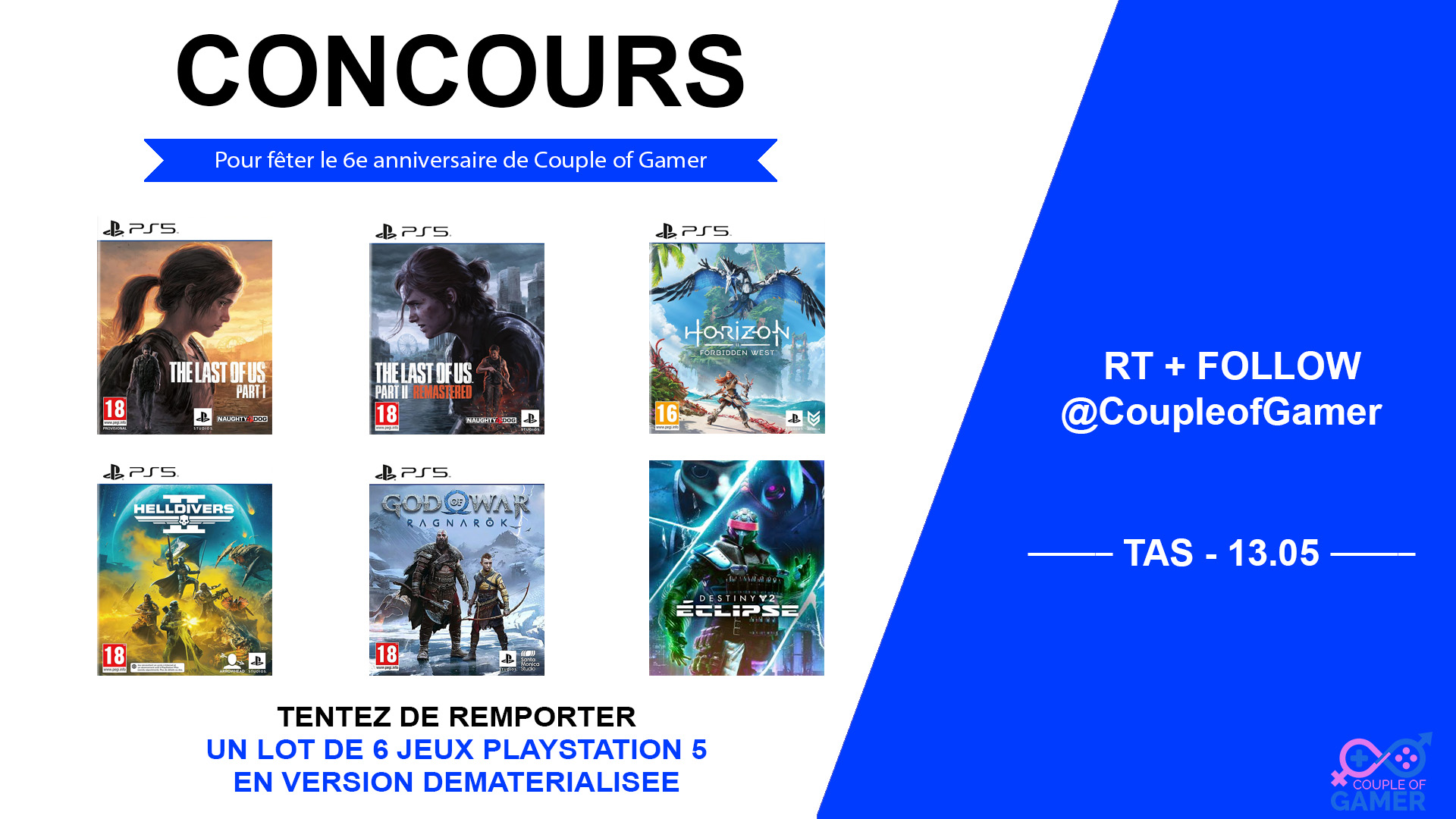 #Concours Pour fêter nos 6 ans On vous fait gagner 6 jeux PlayStation 5 en version dématérialisée (généreusement offert par @PlayStationFR) Pour participer RT + Follow @CoupleOfGamer TAS le 13/05 🍀Bonne chance🍀 #CoG #PlayStation