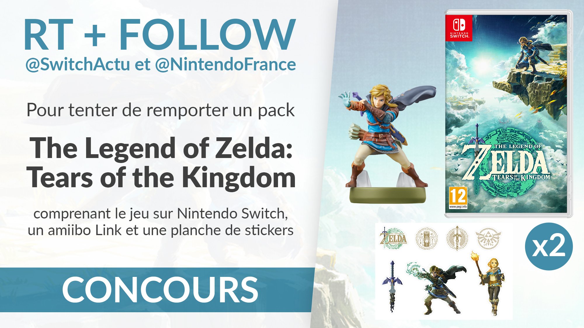 #CONCOURS - Pour fêter le premier anniversaire du titre, tente de remporter un pack The Legend of Zelda: #TearsOfTheKingdom comprenant le jeu, un amiibo Link et une planche de stickers ! Pour participer : 🔁 RT ce post 👉 Follow @SwitchActu et @NintendoFrance --- 🇫🇷 France