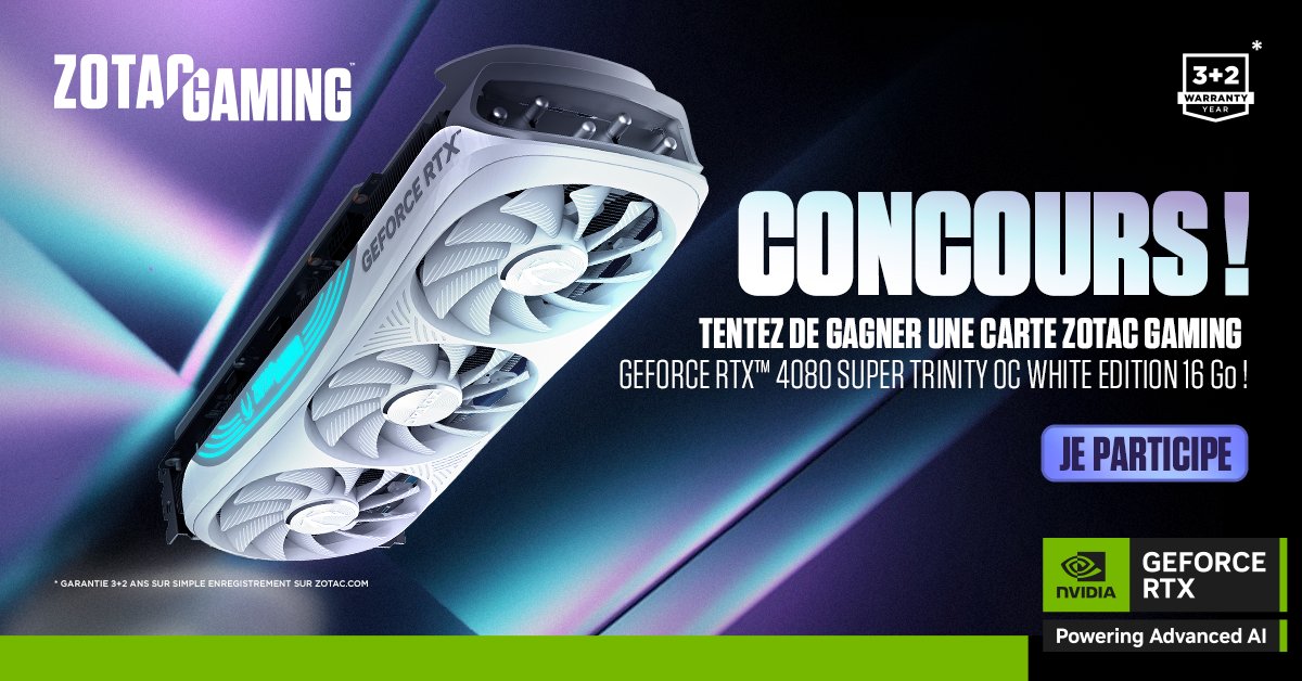 Tente de gagner une @ZOTACFrance RTX 4080 SUPER TRINITY OC! Pour participer :💚Like et 🔃 RT ce post. Follow @NVIDIAGeForceFR, @ZOTACFrance et @Mynthos #RTXOn #ZOTACGAMING TAS : 18/07 Collaboration Commerciale.