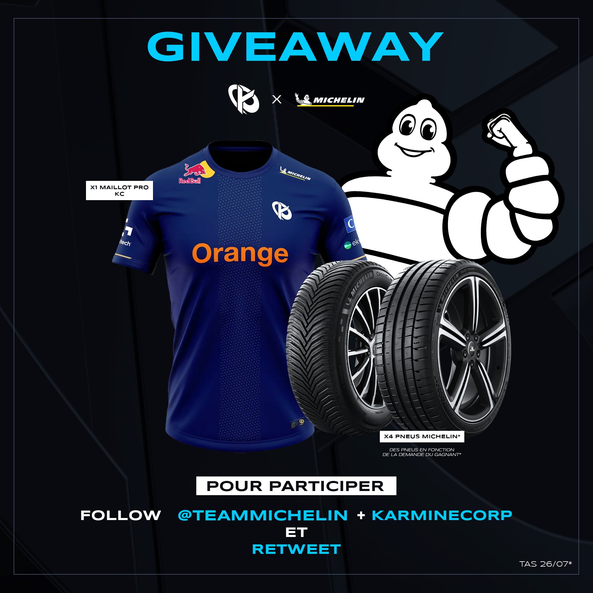 On a décidé d'organiser un petit concours avec les frérots @TeamMichelin avec à gagner : 1 maillot pro KCORP 2024 ainsi qu'un set de 4 pneus de votre choix ! 🛞 Pour participer : ✅ RT ce tweet ✅ Follow @TeamMichelin & @KarmineCorp 🍀 TAS le 26/07, bonne chance à tous !