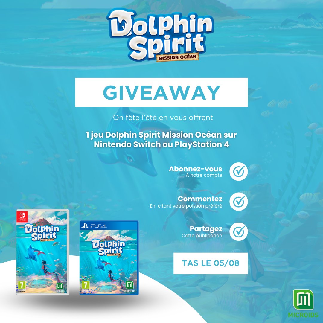 C'est l'été ! Allons nager avec les dauphins ! 🐬 Participez à notre Giveway pour tenter de remporter Dolphin Spirit Mission Océan sur PlayStation 4 ou Nintendo Switch. 🐬 RT + FOLLOW @Microids_off 🐬 Citez en commentaire votre poisson préféré 🏆 TAS le 05/08