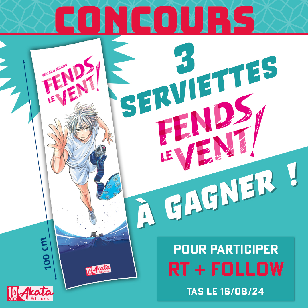 🏆 CONCOURS 🏆 Quand y en a plus, y en a encore ! Aujourd'hui nous vous proposons de remporter 3 serviettes à l'effigie de Shôta le protagoniste de "Fends le vent !". Pour ça, rien de plus simple : suivre @AKATAmanga et retweeter ce poste ! Bonne chance tout le monde ! 🍀